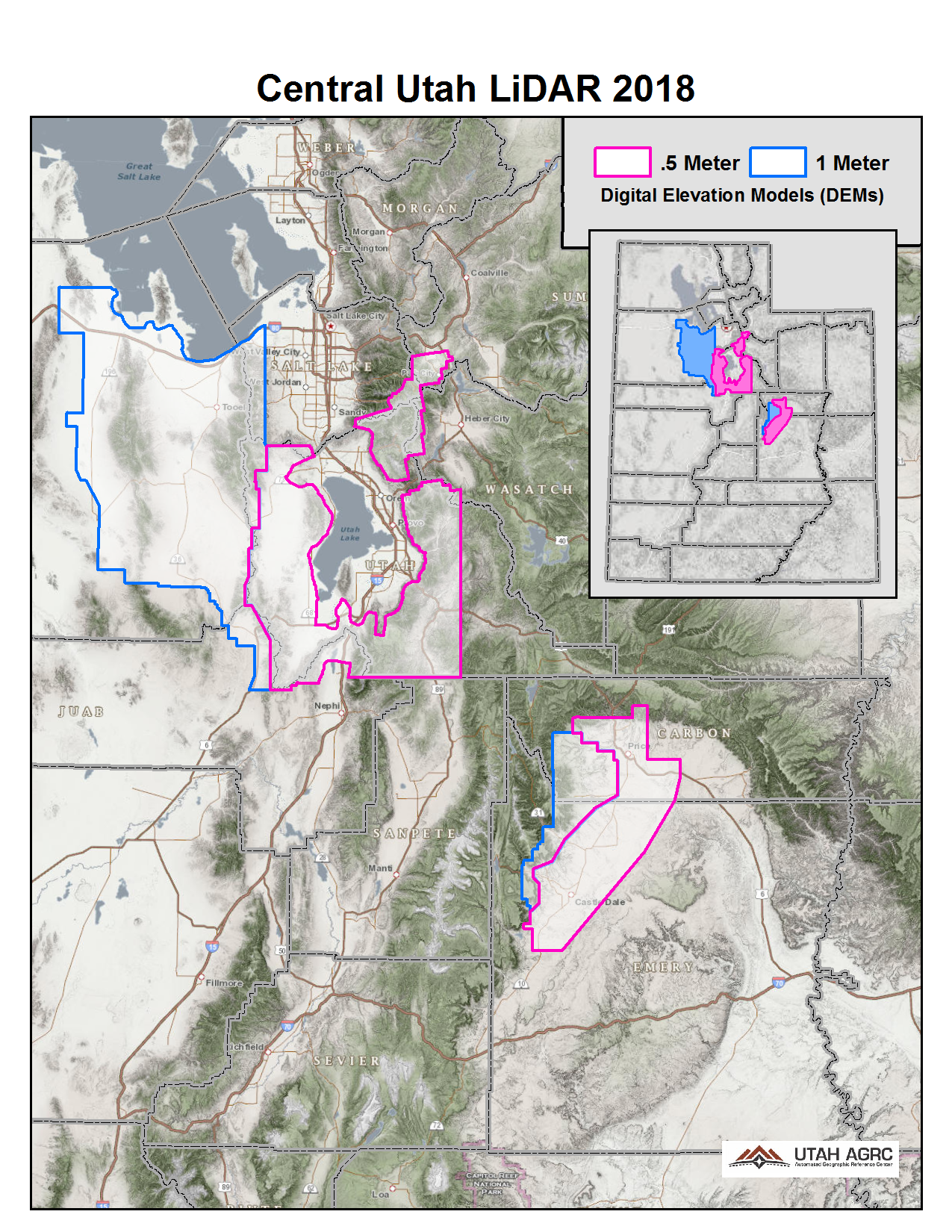 During 2018 UGRC, the Natural Resource Conservation Service (NRCS), and the Utah Geological Survey (UGS) acquired ~440 square miles of 8 points per meter Quality Level 1 Lidar in Central Utah. The 0.5 meter resolution bare earth DEMs and first-return/highest-hit DSMs in .img format have a 10.0cm vertical RMSE accuracy and are available for download. The LAS point clouds are available from The National Map , opens in a new tab .