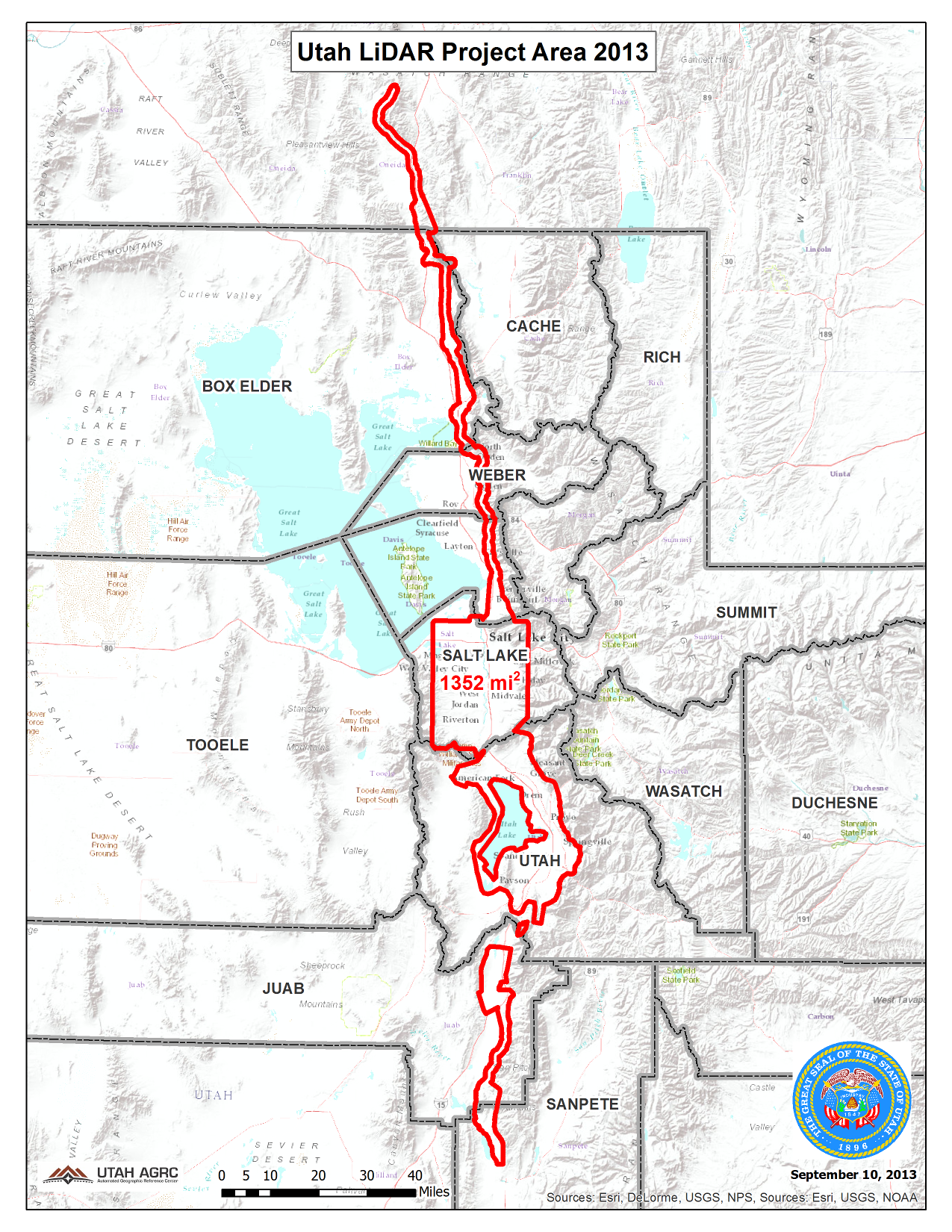 During the Fall of 2013 and the Spring of 2014 UGRC and partners acquired 1,422 square miles of 8 points per meter Quality Level 1 Lidar for areas along the Wasatch Front including the urbanized areas of Salt Lake County and Utah County and areas along the Wasatch Fault from Sanpete County north into Oneida County in southeast Idaho. The 0.5 meter resolution bare earth hydro flattened DTMs and first-return/highest-hit DSMs in .img format have a 9.25cm vertical RMSE accuracy. The LAS point clouds are available from The National Map , opens in a new tab .